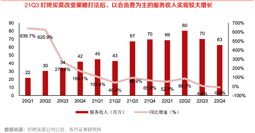 經典案例:根據叮咚買菜公司公告、東方證券研究所等綜合資訊表明,21Q3 叮咚買菜改變策略打法后 積極推廣會員制度,提高用戶粘性,21Q3 服務收入實現階梯式增長,同比增長 95.9%,環比增 長 57.1%。22Q3,盡管服務收入增長放緩,綠卡會員對收入的貢獻依舊顯著。