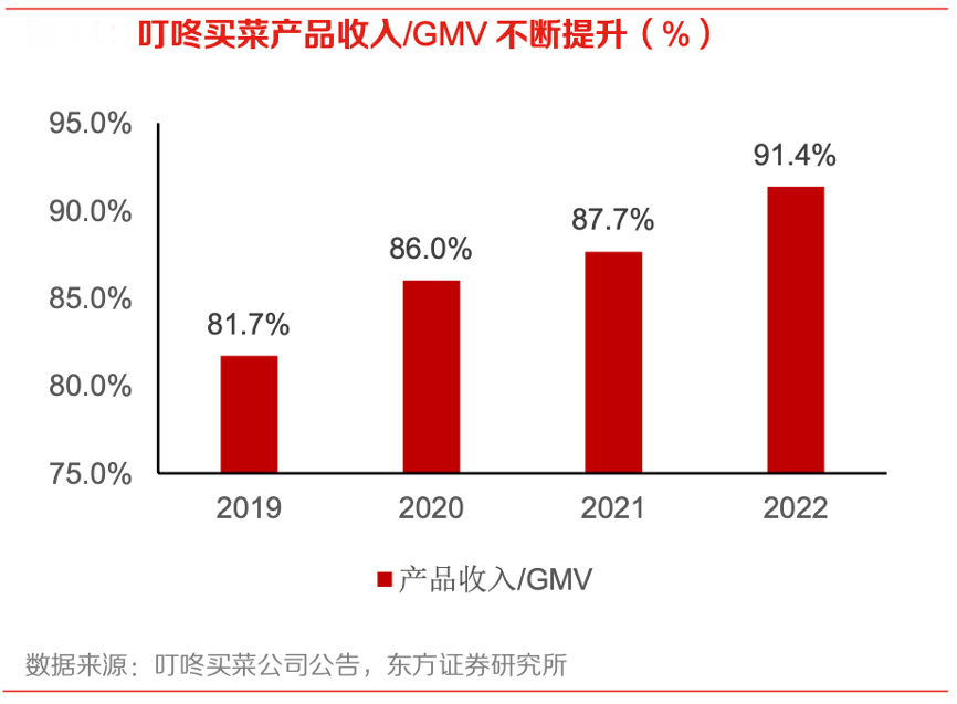 經典案例:根據叮咚買菜公司公告、東方證券研究所等綜合資訊表明,在 GMV 向收入的有效轉化方面,叮咚買菜減少無效的優惠券發放,更多集中于 綠卡會員優質用戶的優惠券營銷,從而提高收入端的增長。從數據口徑來看, 2019 年至 2022 年叮咚買菜產品收入/GMV 比例提升近 10 個百分點,可見優惠券的發放力度在不斷減小。