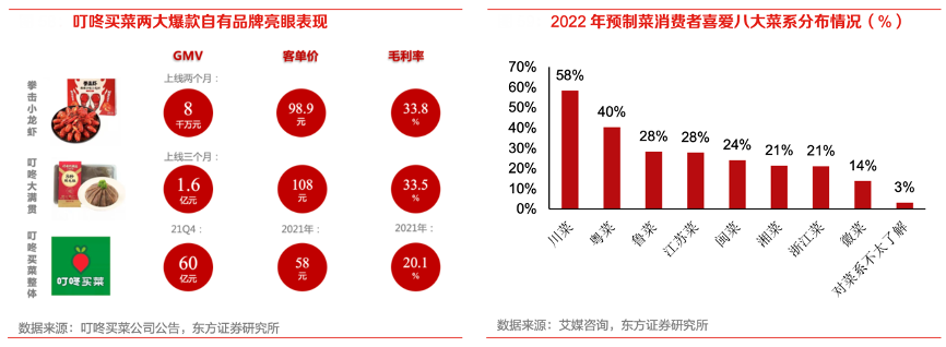 經典案例:根據叮咚買菜公司公告、艾媒咨詢、東方證券研究所等綜合資訊表明,叮咚買菜以現有用戶群體為基礎,爆款單品為切入點,在預制菜品類生產銷售上獲得階段性的成功。在 21Q4,叮咚買菜一大爆款產品一經推出即獲得了消費者的喜愛,同時也為叮咚的收入增長和客單價提升貢獻重要力量,拳擊小龍蝦上線兩個月 GMV 達 8 千萬元,平均客單價為 98.9 元,毛利率達 33.8%。