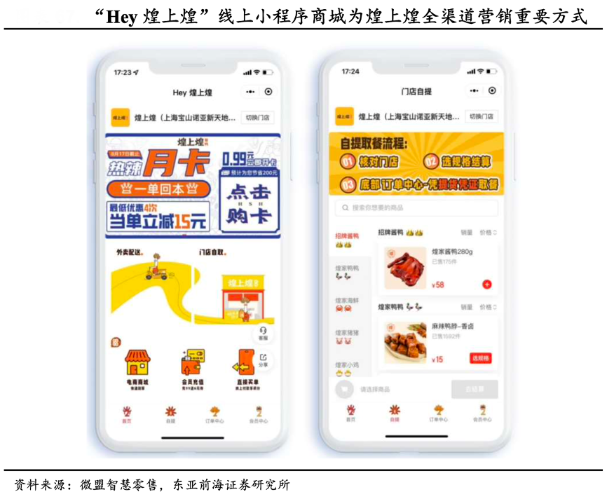 經(jīng)典案例:根據(jù)微盟智慧零售、東亞前海證券研究所等綜合資訊表明,煌上煌轉(zhuǎn)戰(zhàn)線上及互聯(lián)網(wǎng)平臺(tái),積極布局新零售,進(jìn)行全渠道營(yíng)銷(xiāo)。其搭建“Hey 煌上煌”線上小程序商城,引流線下門(mén)店并添加顧客至微信群,后續(xù)通過(guò)優(yōu)惠券推送提高復(fù)購(gòu)率,2022 年 7 月,小程序商城月度 GMV 突 破 1000 萬(wàn)元;同時(shí)重構(gòu)內(nèi)容營(yíng)銷(xiāo)矩陣,聚焦“兩微一抖”等平臺(tái),實(shí)現(xiàn)加盟商門(mén)店一店一播,同時(shí)通過(guò)微信公眾號(hào)、抖音等渠道進(jìn)行宣傳及福利種草,進(jìn)一步實(shí)現(xiàn)消費(fèi)轉(zhuǎn)化。