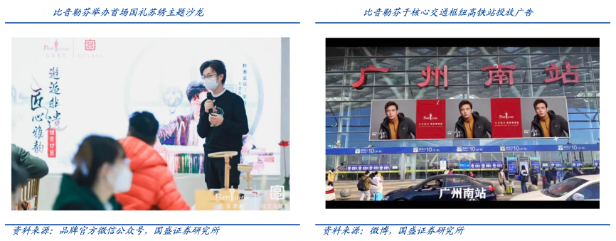 經(jīng)典案例:根據(jù)贏商大數(shù)據(jù)、wind、微信、品牌官方微信公眾號、微博、國盛證券研究所等綜合資訊表明,作為以高爾夫?yàn)槠放苹颉⒁灾懈叨松虅?wù)客群為核心目標(biāo)用戶的品牌,比音勒芬公司并沒有采用傳統(tǒng)服飾品牌偏好的流量明星代言的思路,而是針對品牌形象及核心客群進(jìn)行精準(zhǔn)營銷,具體包括贊助高爾夫相關(guān)賽事、合作國家高爾夫隊、在機(jī)場及高鐵站投放廣告、登陸權(quán)威 媒體等。