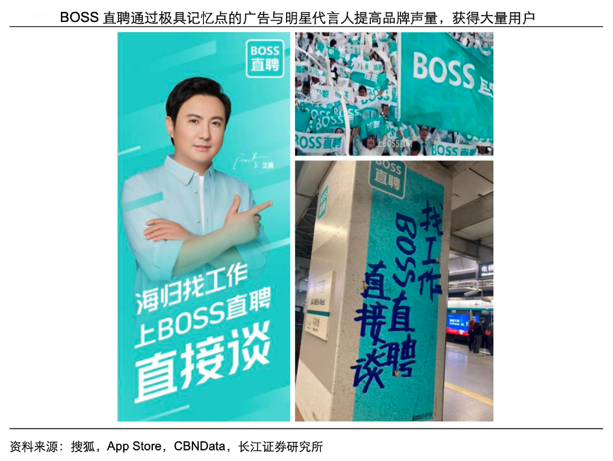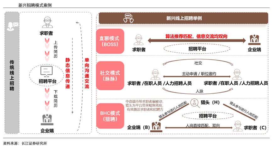 經(jīng)典案例:根據(jù)長(zhǎng)江證券研究所等綜合資訊表明,BOSS直聘創(chuàng)新的直聊模式通過(guò)算法推薦高效進(jìn)行人崗匹配,信息交流均為雙向,縮短傳統(tǒng)招聘的搜索流程;脈脈等平臺(tái)從社交切入招聘,通過(guò)在職員工、求職人員、招聘人員的信息 分享建立社交人脈關(guān)系,打破信息繭房。