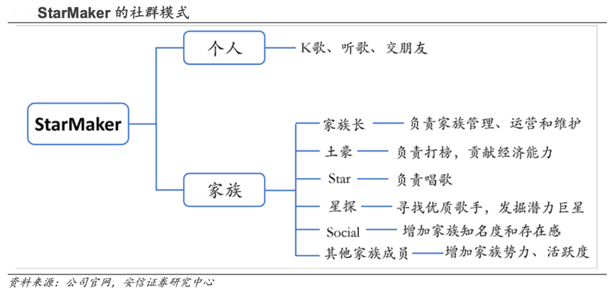 經(jīng)典案例:根據(jù)公司官網(wǎng)、安信證券研究中心等綜合資訊表明,StarMaker 通過強社交屬性與海量音樂版權加固競爭壁壘。StarMaker 加入語音聊天室 K 歌模式,打造 200 人左右“家族”式社交 群,家族人數(shù)受限,使得家族長在審核成員時格外認真,普通成員全力貢獻自己的力量,用戶形成緊密社群關系。