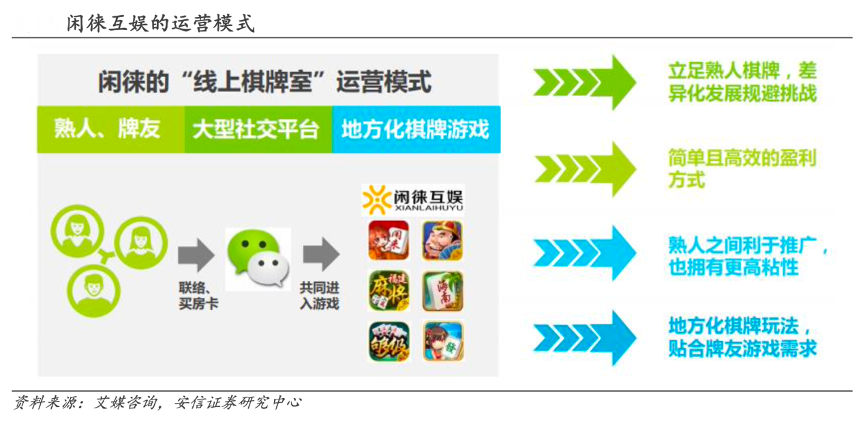 經(jīng)典案例:根據(jù)艾媒咨詢、安信證券研究中心等綜合資訊表明,閑徠互娛主要的銷售模式是房卡模式,相當于將線下棋牌室移到線上。先在當?shù)赝茝V吸引第一批客戶,再利用類似微商代理模式,在熟人中迅速傳播。靠熟人傳播,閑徠互娛的用戶規(guī)模和用戶粘性遠高于同類棋牌游戲。