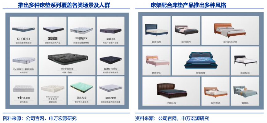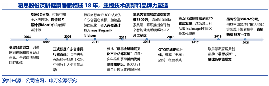 經(jīng)典案例:根據(jù)公司官網(wǎng)、申萬(wàn)宏源研究等綜合資訊表明,慕思股份創(chuàng)立于 2004 年,總部位于廣東東莞,從事健康睡眠系統(tǒng)的研發(fā)、生產(chǎn)和銷售,主要產(chǎn)品為床墊及床架;床墊涵蓋 0769、 3D、歌蒂婭、凱奇主線產(chǎn)品系列,并快速擴(kuò)充新北歐、兒童、助眠等新系列,全面覆蓋各類消費(fèi)場(chǎng)景和人群。