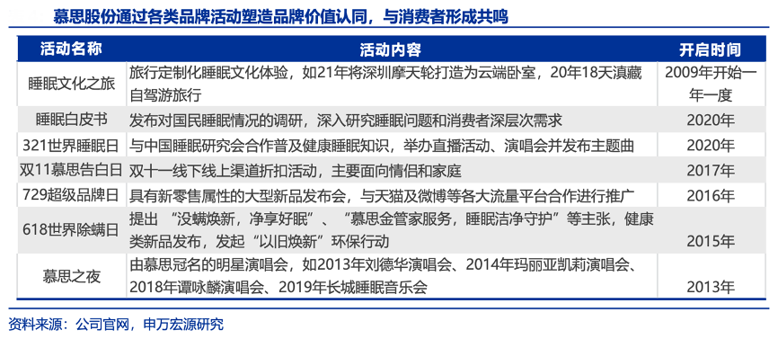 經典案例:根據公司官網、申萬宏源研究等綜合資訊表明,慕思股份一方面,開 始舉行睡眠文化之旅,發布睡眠白皮書、打造“321 世界睡眠日”、“618 世界除螨日”、“729超級品牌日”、“818慕思全球睡眠文化之旅”、“ 雙11慕思告白日”五大IP活動,通過認知、體驗等方式將健康睡眠文化植入消費者心智,塑造品牌價值認同、與消費者形成共鳴;另一方面,聚焦健康睡眠,推出“私人訂制,健康睡眠”、“善夢者享非凡”、“今 晚,睡好一點”等品牌主張。公司通過系列 IP 的運營,豐富健康睡眠文化內涵,塑造睡 眠解決方案的品牌形象。