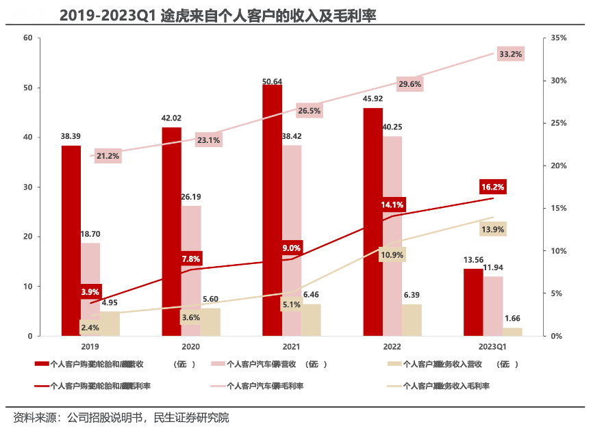 經典案例:根據公司招股說明書、民生證券研究院等綜合資訊表明,途虎公司向個人終端客戶提供汽車產品和服務的產品結構實現了升級。2019-2023Q1 公司由以輪胎和底盤零售為主向更高毛利率的汽車保養業務轉變, 2023Q1汽車保養業務營收約為 12 億元,達 37%占比,其毛利率達到峰值 33.2%。