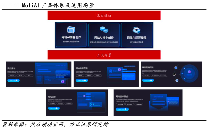 經(jīng)典案例:根據(jù)焦點(diǎn)領(lǐng)動(dòng)官網(wǎng)、方正證券研究所等綜合資訊表明,焦點(diǎn)科技自研人工智能“MoliAI”,深度適配外貿(mào)建站需求。MOliAI 基于跨境貿(mào)易企業(yè)網(wǎng)站建設(shè)和運(yùn)營需求,預(yù)設(shè)了 70+實(shí)用的網(wǎng)站內(nèi)容創(chuàng) 作預(yù)案,覆蓋了高效建站、網(wǎng)站品牌塑造、網(wǎng)站運(yùn)營、網(wǎng)站營銷引流、網(wǎng)站客 戶服務(wù) 5 大網(wǎng)站應(yīng)用場景,深度適配外貿(mào)建站實(shí)際應(yīng)用場景。