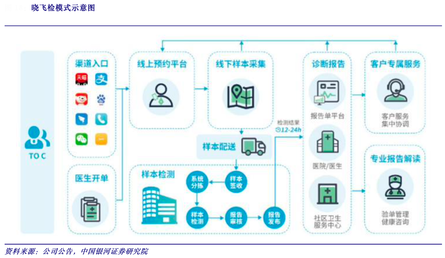 經(jīng)典案例:根據(jù)曉飛檢小程序、中國(guó)銀河證券研究院等綜合資訊表明,迪安診斷“曉飛檢”將醫(yī)院檢驗(yàn)科搬到線(xiàn)上,增強(qiáng)醫(yī)檢服務(wù)終端觸達(dá)。目前曉飛檢在微信小程序商城、支付寶醫(yī)療健康、天貓、京東等線(xiàn)上渠道開(kāi)放預(yù)約,實(shí) 現(xiàn)“線(xiàn)上預(yù)約下單-線(xiàn)下就近采血點(diǎn)采血-線(xiàn)上一鍵查收?qǐng)?bào)告”全鏈路操作的打通。