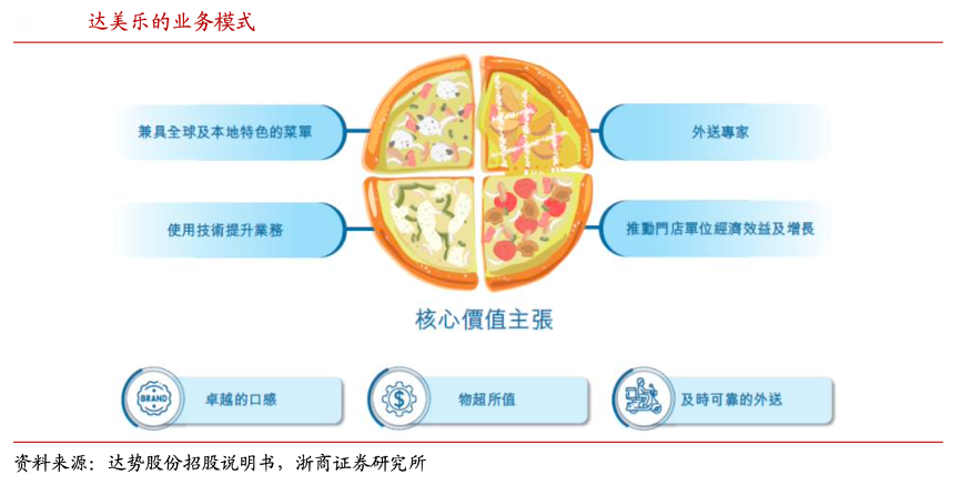 經典案例:根據達勢股份招股說明書、浙商證券研究所等綜合資訊表明,達美樂中國致力于成為比薩專家,借助達美樂全球品牌勢能、本土化的管理團隊,尋 求差異化發展。達美樂主要從四個方面推動業務增長,其入選《每日經濟新聞》2023 食品飲料行業最受“Z 世 代”喜愛品牌 TOP10。