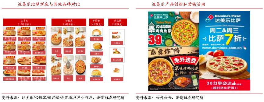 經典案例:根據達美樂/必勝客/棒約翰/樂凱撒點單小程序、公司公告、浙商證券研究所等綜合資訊表明,達美樂中國公司基于本地市場調研、達美樂全球化市 場洞察(如韓式炸雞和日式鰻魚),每 6-12 周會推出一款新的比薩產品。另外,在中國比薩市場中公司可供選擇的比薩餅底最多,如經典手拍、輕巧薄脆、雙層芝士卷邊等,公司已經推出 12 種餅底。