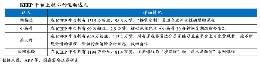經(jīng)典案例:根據(jù)APP、國泰君安證券研究等綜合資訊表明,KEEP公司已簽約帕梅拉、小馬哥、 周六野等知名運動健身博主,如帕梅拉在 KEEP 平臺擁有 1514 萬粉絲,推出包括《帕梅拉內(nèi)啡肽燃脂系列》、《帕梅拉 15 分鐘完美天鵝臂》、《帕梅拉 15 分鐘翹臀魔法》等課程。