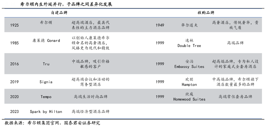 經典案例:根據希爾頓集團官網、國泰君安證券研究等綜合資訊表明,目前希爾頓旗下共擁有 19 個品牌,覆蓋中端至奢華酒店以及度假俱樂部多個產品線。自創立以來,集團就通過內部自建與外部收購并舉的形式構建完善品牌矩 陣,除去分時度假俱樂部,涵蓋了 13 個自建品牌和 5 個收購品牌;截至 2021 年底,希爾頓自建與 收購品牌酒店數量占比分別為 38%和 62%。