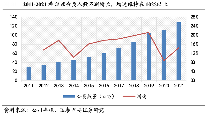 經典案例:根據公司年報、國泰君安證券研究等綜合資訊表明,“希爾頓榮譽客會”客戶忠誠計劃始于 1987 年,目前共設有 5 個會員等級:藍卡、銀卡、金卡、鉆卡、終身鉆卡,其中銀卡、 金卡、鉆卡分別需要每年入住 10、40、60 晚即可獲得。基于不同會員 等級,客戶能夠享受差異化積分累積加成、客房升級、免費早餐、行政 酒廊等會員特權。2011-2021 希爾頓會員數量由 3000 萬增至 1.28 億,年復合增速達 15.6%,保持高速增長。