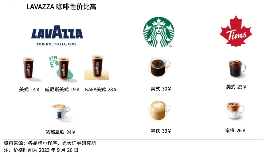 經(jīng)典案例:根據(jù)各品牌小程序、光大證券研究所等綜合資訊表明,LAVAZZA 品牌調(diào)性高,主打純正意式咖啡,但從定價(jià)來(lái)看略低于星巴克和 Tims,具有較高性價(jià)比。與其他咖啡品牌相比,LAVAZZA 提供豐富的意式烘焙和特色三明治, 有利于增強(qiáng)消費(fèi)粘性。