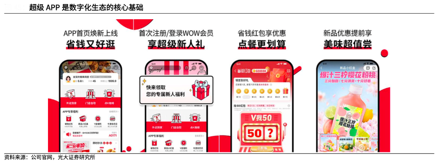 經典案例:根據公司官網、光大證券研究所等綜合資訊表明,作為行業內數字化創新先鋒,百勝中國于 2016 年陸續推出肯德基和必勝客的超級 Apps,成為首批向顧客提供移動化支付的連鎖餐廳之一。超級 App 支持支付寶、微信支付和神錢包等支付方式,隨著移動支付普及程度的提高和消費者習慣 的改變,數字化支付占公司銷售額的比例逐年提高,由 2016 年的 33%提升至 2022 年的 99%。除移動化支付外,超級 Apps 提供在線點餐功能,給消費者帶來便利的同時減少門店運營成本,提高餐廳整體盈利能力。