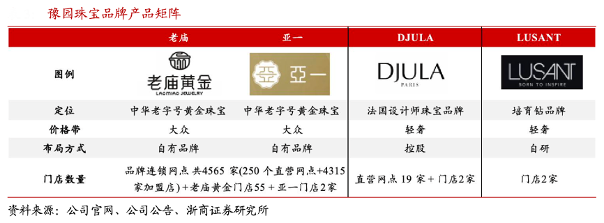 經典案例:根據公司官網、公司公告、浙商證券研究所等綜合資訊表明,豫園股份收購+合作+孵化,構建多元化品牌矩陣。公司珠寶時尚旗下品牌包括:1)豫園珠寶 時尚集團控股法國珠寶品牌 DJULA,DJULA 定位年輕時尚,以強設計為驅動,截至 22 年 DJULA 直營網點 19 家。2)前瞻布局成立培育鉆石品牌露璨 LUSANT,并于 22 年開始線 下布局。