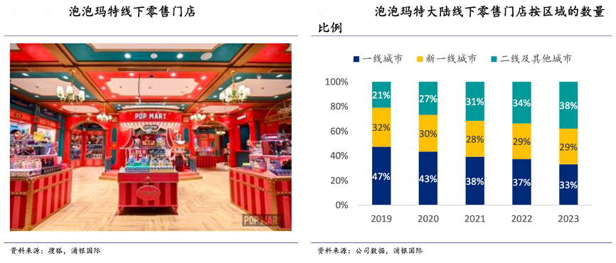 經典案例:根據搜狐、公司數據、浦銀國際等綜合資訊表明,泡泡瑪特的每家線下 門店都試圖打造一個充滿童趣和夢幻感的空間,為消費者帶去快樂美好的 沉浸式購物體驗的同時,同時也向消費者傳遞自有藝術家 IP 的不同個性和 內涵。截止到 2023 年底,泡泡瑪特在全國一共擁有 363 家線下門店,已基本覆蓋所有高線市場,并逐步向低線市場的主要商圈滲透。