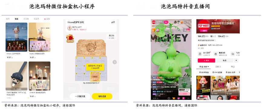 經典案例:根據泡泡瑪特微信抽盒機小程序、泡泡瑪特抖音直播間、浦銀國際等綜合資訊表明,2024年上半年,泡泡瑪特公司也積極調整線上運營策略,在抖音上開通了針對不同品類、不同使用場景以及藝術家 IP 的直播間,擴大用戶觸達范圍的同時滿足更精準用戶的需求。截至 2023 年,抖音渠道占公司線上收入的比例達到了 17%。