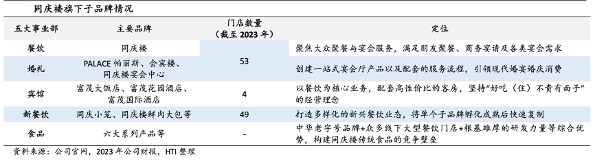 經典案例:根據公司官網、2023年公司財報、HTI等綜合資訊表明,同慶樓公司 2020 年新設五大事業部,餐飲部仍以同慶樓為核心專注聚餐、宴會等“社交餐飲”,婚禮、賓館、食品則在餐飲基礎上各自附加特化屬性,分別主攻一站式婚禮業務、住宿&商務會議功能以及居家復刻屬性,新餐飲則涉獵各地方、中西菜系,以菜系經典單品為核心擴展菜單,旨在通過模板化單店模型快捷復制擴張。