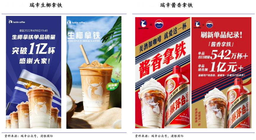 經典案例:根據瑞幸公眾號、浦銀國際等綜合資訊表明,瑞幸無疑是現制咖啡產品創新的先鋒和領導者。為了迎合這部分年輕人的口味,瑞幸于 2021 年 4 月推出了爆款產品——生椰拿鐵,在現制咖啡行業中制造了巨大的聲浪。2023 年 9 月,瑞幸跨界開啟與茅臺的合作,將茅臺產品融入咖啡,推出醬香拿鐵產品。醬香拿鐵的話題在社交媒體上持續傳播,迅速成為網絡熱搜的焦點。