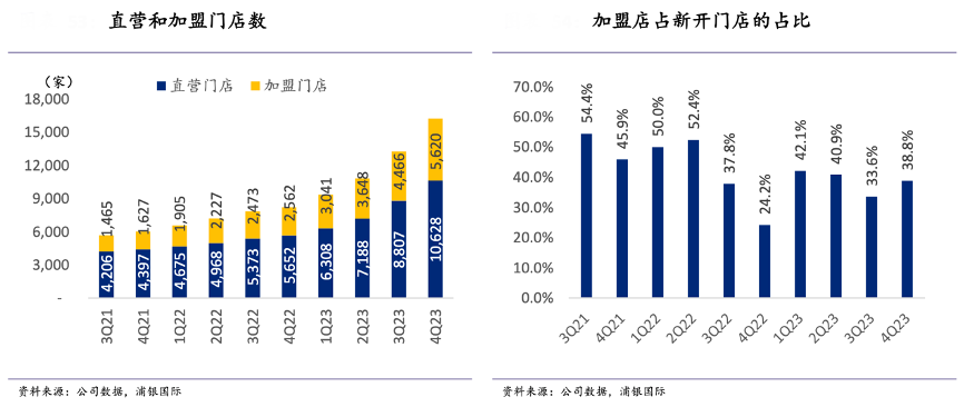 經典案例:根據公司數據、浦銀國際等綜合資訊表明,基于咖啡行業在低線城市巨大的市場需求,瑞幸確定了以聯營模式、依托加 盟商在當地的優質資源向下沉市場拓張的戰略。過去三年里,瑞幸的加盟商門店數的增速遠高于直營門店數。這意味著瑞幸正積極地向低線市場進行滲透。截至 2023 年末,瑞幸加盟門店數已經占到公司整體門店數的 34.6%。