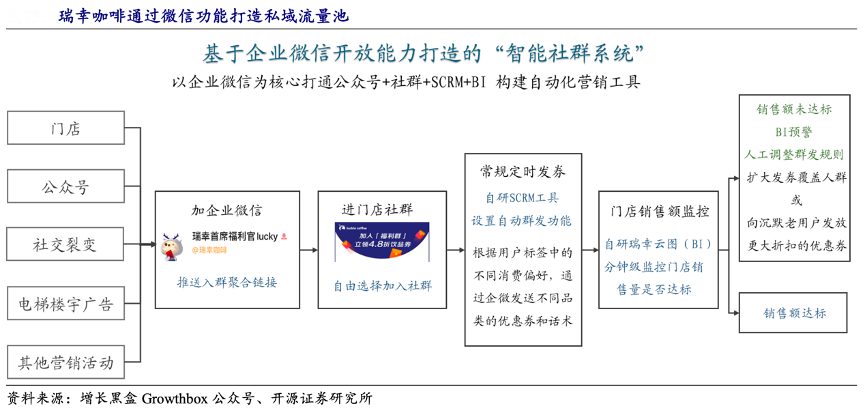 經(jīng)典案例:根據(jù)增長(zhǎng)黑盒Growthbox公眾號(hào)、開(kāi)源證券研究所等綜合資訊表明,隨著消費(fèi)人群增加,瑞幸開(kāi)始通過(guò)大量企業(yè)微信社群構(gòu)建用戶私域流量池,并采用積分、優(yōu)惠券、折扣等獎(jiǎng)勵(lì)機(jī)制,增加用戶的黏性,提高用戶復(fù)購(gòu)率。
