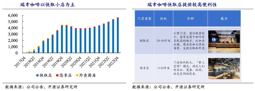 經(jīng)典案例:根據(jù)公司公告、開(kāi)源證券研究所等綜合資訊表明,瑞幸咖啡門店類型大部分以快取店為主。瑞幸的快取門店集中在咖啡需求量較大的地區(qū),例如寫(xiě)字樓、商業(yè)區(qū)和大學(xué)校園,同時(shí)門店面積小,大部分在 20-60 平方米之間,定位“快咖啡”消費(fèi)場(chǎng)景。