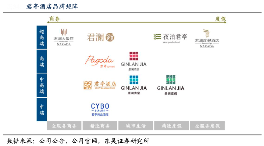 經典案例:根據公司公告、公司官網、東吳證券研究所等綜合資訊表明,截至 2022 年 2 月,君瀾品牌布局浙江、江蘇、海南等超 23 個省市,累計投資管理超過 180 家酒店,景瀾布局遍及浙江、海南、吉林等 13 個省市,累計投資管理酒 店 75 家。收購完成后,君亭實現規模躍遷,正式躋身于國內民族酒店集團前列,至此,君亭的品牌矩陣進一步完善,完成對中高端和高端商務以及休閑品牌的全覆蓋。