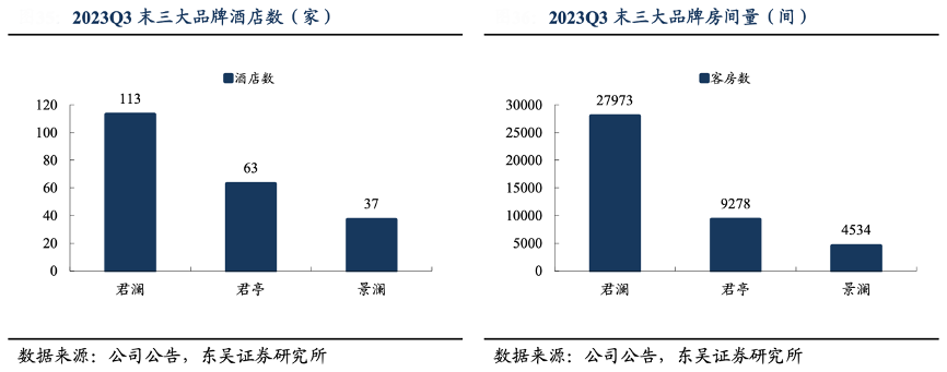 經典案例:根據公司公告、東吳證券研究所等綜合資訊表明,君亭君瀾旗下包含“君瀾大飯店”、“君瀾度假酒店”以及“君瀾理”,領銜高端度假、商旅酒店行業。景瀾源于君瀾,定位中高端社區生活酒店,發展出“景瀾酒店”、“景瀾度假”以及“景瀾青棠”。截至 2023 年 Q3 末,君瀾、君亭與景瀾開業酒店數分別為 113/63/37 家,房間數分別為 27973/9278/4534 間。三大品牌定位互補,深耕高端度假與商旅酒店市場。