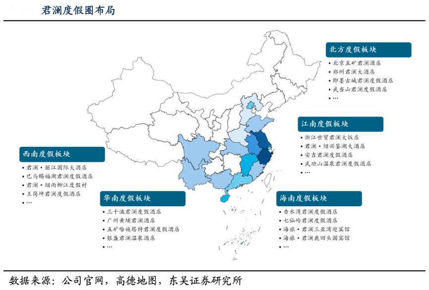 經典案例:根據公司官網、高德地圖、東吳證券研究所等綜合資訊表明,君瀾依托濱海、溫泉、古城古鎮等優質旅游目的地,整合景區和物業資源,打造“四南一北”全國度假圈布局,有機結合中 國各地地域文化、民族文化以及特色文化,為消費者提供類別豐富的高端休閑度假產品。