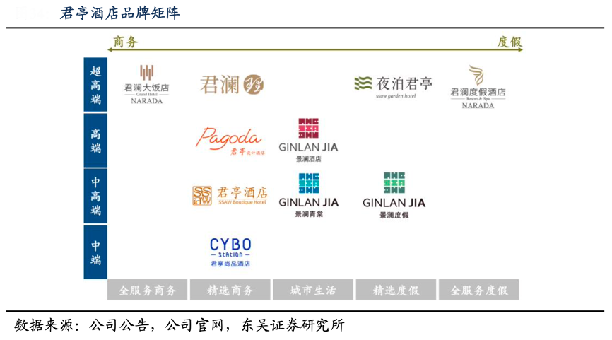 經(jīng)典案例:根據(jù)公司公告、公司官網(wǎng)、東吳證券研究所等綜合資訊表明,君亭品牌誕生于 2007 年,截至 2022 年 2 月,君瀾品牌布局浙江、江蘇、海南等超 23 個(gè)省市,累計(jì)投資 管理超過 180 家酒店;收購?fù)瓿珊螅?shí)現(xiàn)規(guī)模躍遷,正式躋身于國內(nèi)民族酒店集團(tuán)前列,至此, 君亭的品牌矩陣進(jìn)一步完善,完成對(duì)中高端和高端商務(wù)以及休閑品牌的全覆蓋。