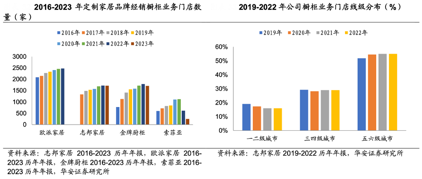 經(jīng)典案例:根據(jù)志邦家居2016-2023歷年年報、歐派家居2016-2023歷年年報、金牌櫥柜2016-2023歷年年報、索菲亞家居2016-2023歷年年報、華安證券研究所等綜合資訊表明,志邦家居積累了大量優(yōu)質(zhì)經(jīng)銷商與門店資源,2024Q1 公司櫥 柜經(jīng)銷門店數(shù)量 1759 家,較 2023 年末增加 44 家,門店數(shù)量有所擴張。從門店線級分布來看,2022 年公司經(jīng) 銷渠道櫥柜業(yè)務一二級城市收入占 16%,三四級城市收入占 29%,五六級城市收 入占 55%,渠道不斷下沉。