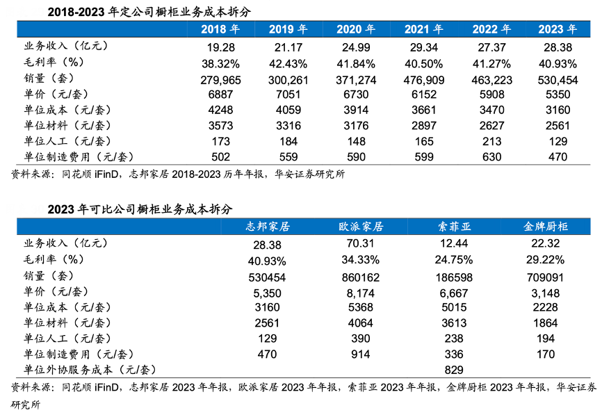 經(jīng)典案例:根據(jù)志邦家居2018-2023歷年年報、志邦家居2023年年報、歐派家居2023年年報、索菲亞2023年年報、金牌櫥柜2023年年報、同花順iFinD、華安證券研究所等綜合資訊表明,志邦家居公司業(yè)務規(guī)模持續(xù)擴張,2023 年公司櫥柜業(yè)務毛利率為 40.93%,同期歐派家居/金牌廚柜/索菲亞/皮阿諾/好萊客 廚柜業(yè)務毛利率分別為 34.33%/29.22%/24.75%/26.95%/26.07%,顯著領先于行業(yè)競爭對手。