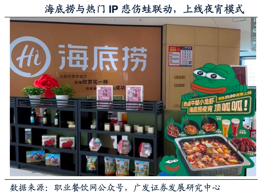 經典案例:根據職業餐飲網公眾號、廣發證券發展研究中心等綜合資訊表明,2023年暑期海底撈近1000家門店每晚上線夜宵,增加小龍蝦、鹵味、牛蛙鍋、精釀啤酒等產品,聯動熱門IP悲傷蛙,每晚定時發起猜拳活動。