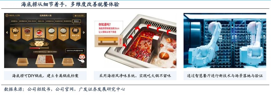 經典案例:根據公司招股書、公司官網、廣發證券發展研究中心等綜合資訊表明,本著以客為本的文化,海底撈致力于在就餐的每個環節為顧客提供周到、貼心和個性化的服務。在客人 落座后,海底撈細致入微的服務貫穿了顧客點餐、用餐的每個環節,如提供熱毛巾、圍裙、手機套、撈面表演和京劇表演等,海底撈還給予員工較大自由度,讓員工可以創造性地為顧客提供差異化服務,如為戴眼鏡的顧客提供眼鏡布,為長發顧客提 供發帶,為帶嬰兒就餐的顧客提供嬰兒床等。