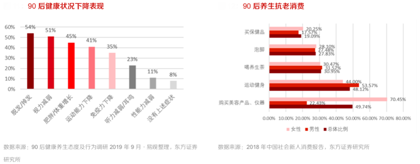 我們已經進入了數字化技術驅動的“品質消費時代“,健康消費成為時代潮流。根據易觀、東方證券等綜合資訊表明,90后健康狀況下降明顯,脫發/掉發(54%)、視力減弱(51%)、肥胖//體重增長(45%)的90后占多數,同時,2018年中國社會新人消費報告顯示,近五成的 90 后受訪者通過購買美容產品、運動健身等方式養生抗老,其中女性偏愛美容護膚,男性偏愛運動健身。