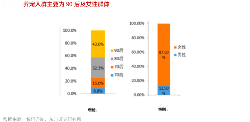 情感陪伴、治愈系情感等是90后消費的極大切入點。“懶系”養狗,精致養貓,重視醫療,為90后養寵帶來新商機。根據智研咨詢、東方證券研究所等綜合資訊表明,養寵人群主要為90后及女性群體,90后在養貓和養狗人群的占比分別為 47.5%和 43.0%,且單只寵物的消費金額呈逐年提升。根據 智研咨詢統計,養寵人群主要為 90 后及女性群體,女性比例高達 87.5%。