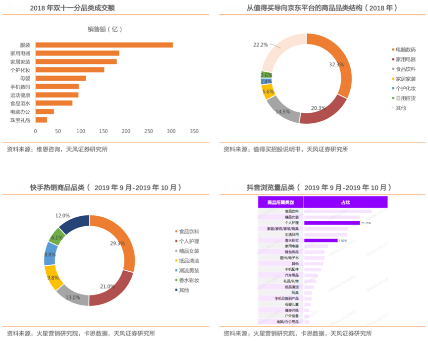 新零售電商企業所處平臺不同,其“品類矩陣構建”有自己的特色,因互聯網平臺不同而具有不同品類結構。據維恩咨詢、值得買招股說明書、火星營銷研究院、天風證券研究所等綜合資訊表明,以阿里、京東等為代表的傳統電商類平臺,其核心交易品類集中在服裝、3C家電、家居家裝等品類,而以快手、抖音等為代表的流量分發內容平臺,其核心品類則集中在食品飲料、美妝、日用品等相對價格更低的商品,流量匯聚更容易,商業變現更方便。