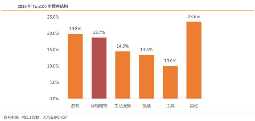持續放大小程序價值,強化小程序的日常服務特性,積極融入游戲娛樂、網絡購物和生活服務等,提高小程序的日常使用頻率和使用滿意度。據阿拉丁指數、天風證券研究所等綜合資訊表明,2019年微信小程序發展迅速,用戶平均使用 60 個小程序,同比增長 100%,游戲和網絡購物類小程序深受歡迎, Top100 小程序中有近1/5 來自于電商行業,這值得引起我們的關注。
