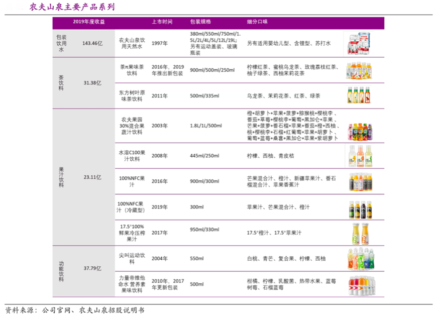 經典案例:根據農夫山泉招股說明書等綜合資訊表明,農夫山泉主要產品包括包裝飲用水以及飲料品類(茶飲料、果汁飲料等),包裝飲用水貢獻了60%以上的營收;飲料品類中,農夫果園、水溶 C100、 尖叫運動飲料是已運營持續 10 年以上的大單品。