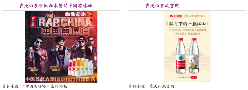 經典案例:根據農夫山泉招股說明書等綜合資訊表明,農夫山泉與中國有嘻哈、偶像練習生等節目合作,2017 年 至 2019 年「力量帝維他命水」的復合增長率超過 47%。同時公司與網易云音樂的「樂瓶」,以及「故宮瓶」等聯名活動通過在水瓶標簽中展現精選樂評、古畫、趣味文字等內容,以“熱點話題”點亮品牌形象。
