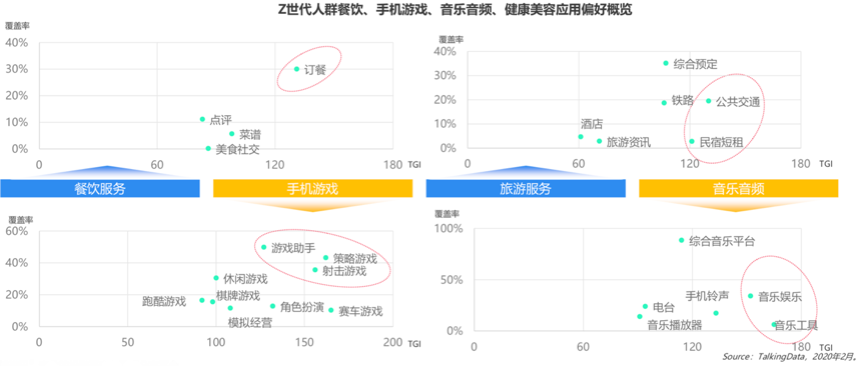 Z世代年輕化特征明顯,同時“興趣導向”更加顯著。根據TalkingData等綜合資訊表明,Z世代對訂餐服務類應用的TGI顯著,外出更偏向使用省錢的公共交通,住宿則偏好文藝屬性較高的民宿短租,對游戲助手、策略游戲、射擊游戲等比較關注,同時對音樂娛樂、音樂工具等比較關注。
