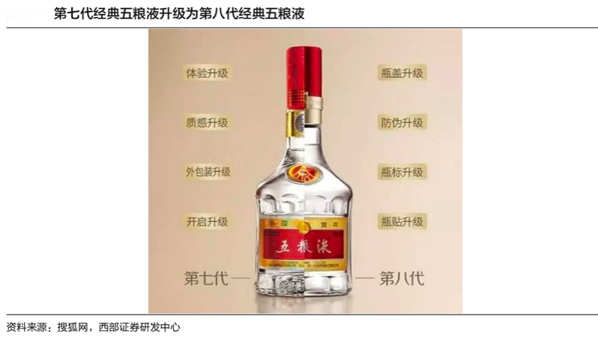 典型案例:五糧液一直是國內(nèi)知名的高端白酒,其先后獲得酒業(yè)大獎(jiǎng),更有優(yōu)秀的產(chǎn)品支撐,同時(shí)明星產(chǎn)品會(huì)持續(xù)迭代,與時(shí)俱進(jìn)。2019 年 6 月,公司核心大單品第八代經(jīng)典五糧液推向市場(chǎng)。新品八代普五從口感、品質(zhì)、包裝和防偽方面均較七代普五有所升級(jí),同時(shí)八代普五出廠價(jià)定為 889 元/瓶, 較七代普五出廠價(jià)高出 100 元/瓶。