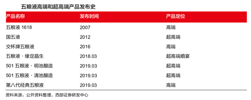 經(jīng)典案例:五糧液持續(xù)推進(jìn)“超高端白酒產(chǎn)品”,鑄造品牌稀缺價(jià)值。據(jù)公開資料顯示,2019 年 3 月,公司發(fā)布全新超高端概念產(chǎn)品“501 五糧液”, 零售成交價(jià)定位 2000-3000 元/瓶,通過限定 501 車間、限定窖池、限定匠人這“三個(gè)限定”, 五糧液高端品牌價(jià)值極盡彰顯。
