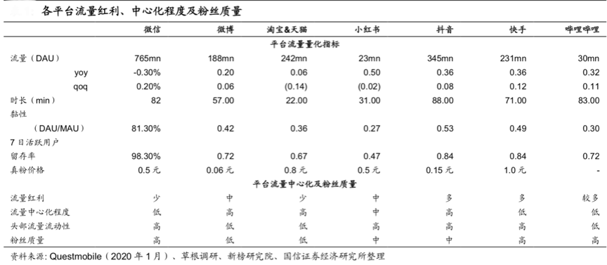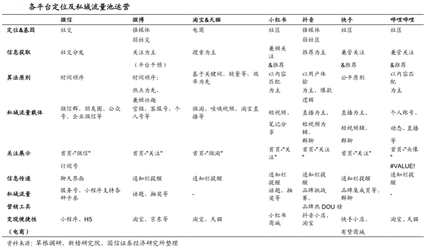 建立健全“品牌私域流量體系”需要企業(yè)深度洞察互聯(lián)網(wǎng)平臺(tái)競(jìng)爭(zhēng)動(dòng)態(tài),放大各平臺(tái)流量紅利,視其流量紅利、中心化程度及粉絲質(zhì)量重構(gòu)“品牌經(jīng)營(yíng)邏輯”,需要更加重視抖音、快手等崛起新力量,同時(shí)強(qiáng)化淘寶天貓等基礎(chǔ)商業(yè)交易陣地,持續(xù)放大“微信主陣地”價(jià)值。根據(jù)Questmobile、草根調(diào)研、新榜研究院和國(guó)信證券研究所等綜合資訊表明,從日活用戶數(shù)角度看,微信一家獨(dú)大,其次是抖音,在之后淘寶 &天貓、快手、微博相差不多,嗶哩嗶哩與小紅書則更加垂直。
