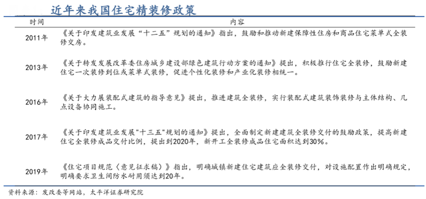“精裝修”和“預裝式建筑”是近年內房地產建材家居行業成長主線。隨著國家房地產政策的更新,近年來地產精裝修政策支持力度大力強化,2017年住建部印發的《建筑業發展“十三五”規劃》中提到,到2020年新開工全裝成品住宅面積占比達到30%,加速了國內精裝修市場的發展。截止到2019年11月份,全國涉及全裝修/精裝修的各類政策累計頒布90次,覆蓋27個省市,其中近兩年呈加速態勢,越來越多省市支持精裝修房的發展。