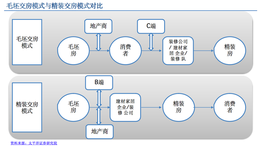 “精裝修”開啟了家居企業B端業務拓展及大宗交易的“寬通道”,細分精裝房市場期盼“行業王者”的誕生。新的家居精裝修行業,創新新的數字化家居消費需求,締造精裝房“產業級領袖品牌”。根據太平洋證券研究院等綜合資訊表明,相比毛坯交房模式,精裝交房模式下地產商可以依托自身平臺集采能力,將上游原材料供應商進行整合,家居建材企業的客戶不再是零售市場分散的消費者,而是擁有較強資源整合力的房地產企業,集中度更高。搶占精裝房產業級地位,締造“精裝消費”大品牌。