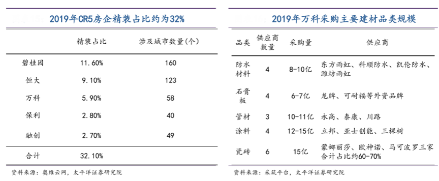 縱觀國內精裝房市場,地產商占據業務主導權,壟斷型市場競爭的態勢日益明顯。根據奧維云網、太平洋證券研究院等綜合資訊表明,2019年TOP5房企精裝修市場份額為32%,同比去年下滑約7個pct,從2019年萬科針對主要建材品類采購情況來看,供應商主要集中于行業頭部幾家企業,涂料、瓷磚的采購規模相對較大,其次為管材和防水,而石膏板在住宅領域占比相對用量較小。