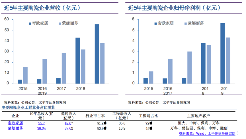 國內精裝修業務經營策劃中,建材家居企業多數愿意和國內知名地產商合作,通過知名地產商、知名地產項目等揚名“精裝修業務領域”,建立精裝修業務領域的“品牌競爭優勢”。根據公司公告、太平洋證券研究院等綜合資訊表明,從2019年營收規模來看,三棵樹營收接近60億(+66.6%),其中工程涂料占比約46.3%(+57.2%),公司連續十年獲得恒大優秀材料設備供應商,工程端業務快速發展;亞士創能19年涂料收入約17.9億元(+55.63%),公司涂料業務主要聚焦在B端,同樣保持較快增速。